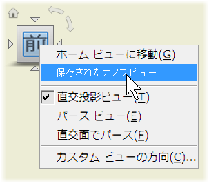 モデルのプレゼンテーション ビューに基づく図面ビューでは、プレゼンテーション ファイル(.ipn)に保存されているカメラ設定にアクセスして、カメラ設定を適用できます。ViewCube を右クリックし、[保存されたカメラ ビュー]をクリックします。
