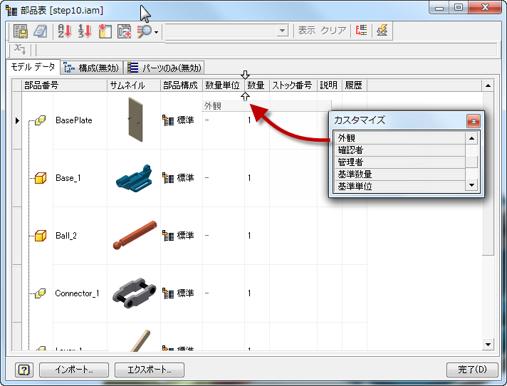 モデルの外観の値は、選択可能なプロパティとして追加されます。部品表またはパーツ一覧に外観のプロパティを追加できます。