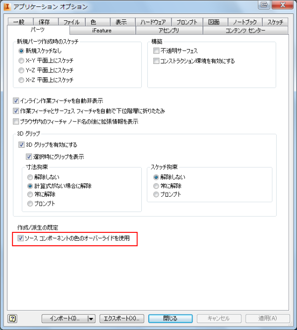 [ソース コンポーネントの色のオーバーライドを使用]チェック ボックスのグローバル設定を既定として指定して、セッション全体でオンまたはオフの状態に維持することができます。このチェック ボックスは、リボンの[ツール]タブの[アプリケーション オプション]ダイアログ ボックスにある[作成/派生の既定]領域からアクセスできます。