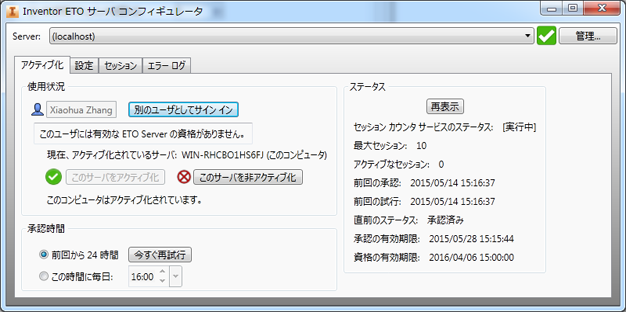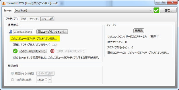 セッション カウンタ サービスにより、Autodesk ライセンス Web サービスに毎日アクセスして、サーバの再承認が試行されます。[Inventor ETO サーバ コンフィギュレータ]ダイアログ ボックスの[アクティブ化]タブでは、サーバの再承認を行う特定の時間を選択することができます。