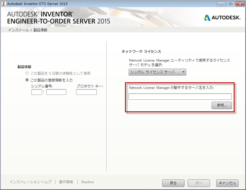 - [製品情報]ページで、ライセンス情報を入力します。ネットワーク ライセンスで選択したサーバの名前を入力します。