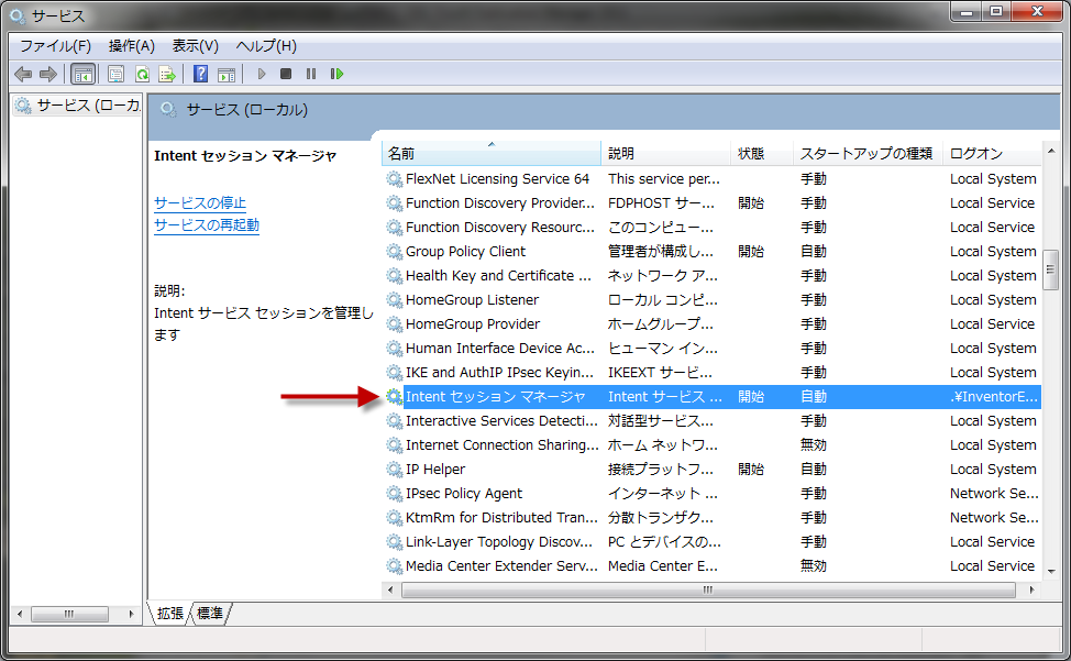 インストール後、[管理ツール] -> [サービス]をチェックして、Intent Session Manager Windows Service が実行されていることを確認します。