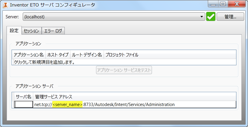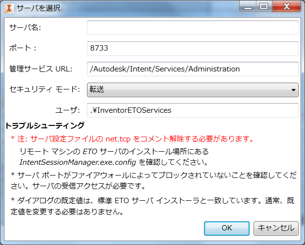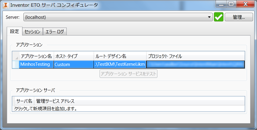 - [Inventor Server]: アプリケーションが使用する Inventor プロジェクト ファイル(*.ipj)を必要とします。