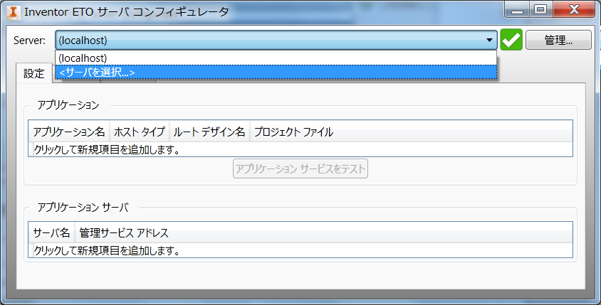 Inventor ETO サーバ コンフィギュレータは、リモート サーバを監視する手段を提供します。定義された追加のサーバは[サーバ]ドロップダウン リストに表示されます。新しいリモート サーバを定義するには、リストで<サーバを選択...>をクリックします。