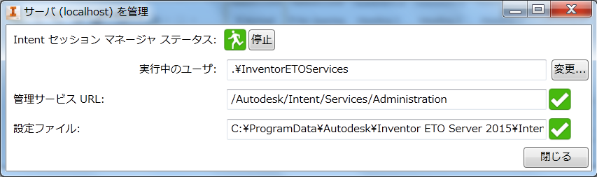 - [Intent セッション マネージャ ステータス]は、Windows サーバのセッション マネージャ サービスを開始および停止します。すべてのサーバ機能を使用可能にするには、このサービスを実行します。現在のステータスが表示され、サービスを手動で開始または停止することができます。このサービスは Windows のサービス リストで Intent セッション マネージャとして表示されます。