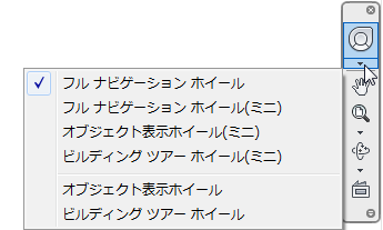 注: ホイール上でカーソルを動かすと、ホイール上の各ウェッジおよび各ボタンのツールチップが表示されます。ナビゲーション ツールを使用するときにメッセージが表示されます。