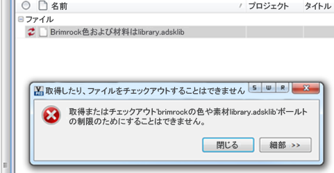 - 別のユーザが Inventor をまだ使用しているときにマテリアル ライブラリを編集した場合、次のエラー メッセージが表示されます。