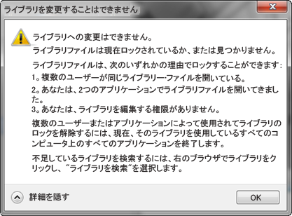 - Vault には、他のユーザのドキュメントで使用されているライブラリをチェックアウトするときに既知の問題があります。以下のエラー メッセージが表示されます。