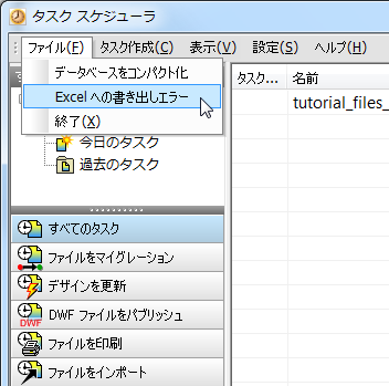 [エラーを Excel に書き出し]は、タスク スケジューラの[ファイル]メニュー、および選択したタスクの右クリック メニューに表示されます。