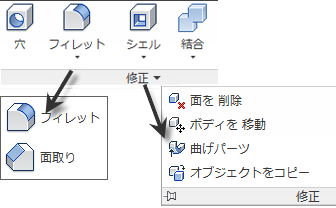 一部のコマンドが、メイン パネルからサブパネルまたはパネル上のドロップダウン リストに移動されました。たとえば、パーツ ファイル(.ipt)の場合、[3D モデル]タブの[修正]パネルが整理され、既定で表示されるコマンドの数が少なくなりました。[修正]のその他のコマンドは、ドロップダウン メニューまたは[修正]の展開表示パネルに移動されました。