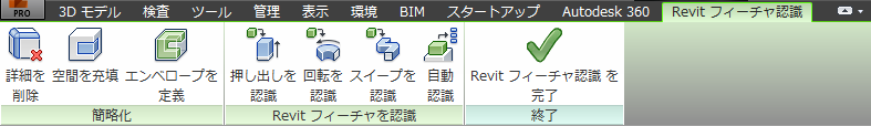 [Revit フィーチャ認識]の環境では、[簡略化]パネルのコマンドを使用して、モデルの複雑度を減らします。Revit によって認識できるフィーチャを使用してモデルを表現するためには、[Revit のフィーチャ]パネルの[認識]コマンドを使用します。
