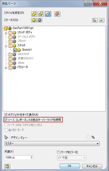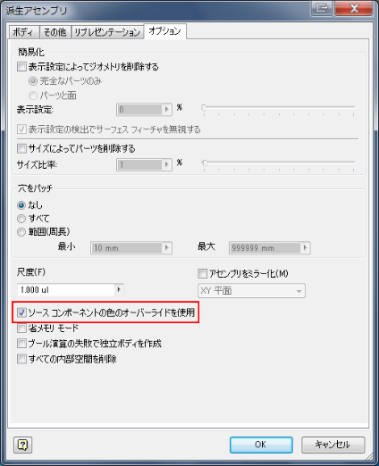 [派生アセンブリ]、[派生パーツ]、[パーツを作成]、[コンポーネントを作成]の各ダイアログ ボックスでは、[ソース コンポーネントの色のオーバーライドを使用]オプションを新たに使用できるようになりました。このチェックボックスをオンにすると、面に適用したパーツの外観およびボディ、フィーチャ、または面の色のオーバーライドが派生パーツから新しいパーツにプッシュされます。オフにすると、外観は既定に設定されます。