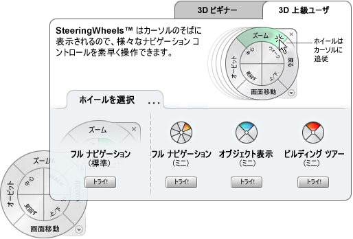 SteeringWheels を最初に表示した時に、画面が 3D ビューに変わると、ホイールのホイール ガイド バルーンが表示されます。ホイール ガイド バルーンは、ホイールの説明機能を果たします。