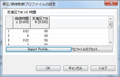データ入力の速度を向上させ、手作業によるデータ入力の際のミスを最小化するために、保圧プロファイルと速度プロファイル用のダイアログ ボックスで、*.csv ファイルのタブ区切りデータをインポートすることができます。