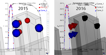 ()をクリックします。 プローブ XY プロットのカーブに対して選択した場所を示す画面上のマーカーが、それぞれの XY カーブのカラーに合わせて色分けされました。さらに、マーカーの形状はプローブの方向を示すようになりました。