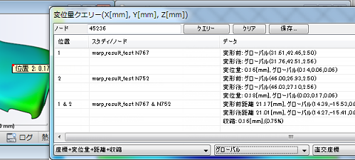 ()をクリックし、任意のスタディのモデルをクリックすると、すべてのスタディに結果が表示されます。 確認のロック機能が反り解析の結果にも拡張され、[変位量クエリー]ダイアログ ボックスは結果を簡単に読むことができるように強化されました。位置、スタディ名、ノードとともに、期待されるデータがすべて示されます。