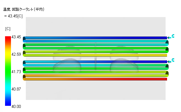 この結果は、冷媒入口の温度からの上昇温度が 5℃ 以下であると最適です。コア内には、この最適な値よりも高い温度があります。