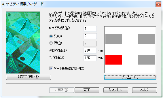 このタスクでは、キャビティ複製ウィザードを使用して、4 個取りレイアウトを作成します。