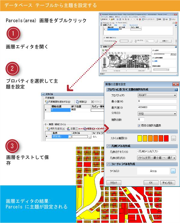 この実習では、データベース テーブルの列(プロパティ)を使用して、平方フィート単位の領域に従い、マップの区域に主題を設定します。