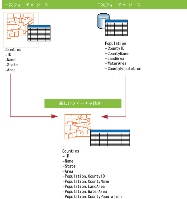 反対側のページの例は、郡の境界線を含むフィーチャ ソースを、人口調査データを含む別のフィーチャ リソースに結合する方法を示しています。通常は以下の手順に従います。