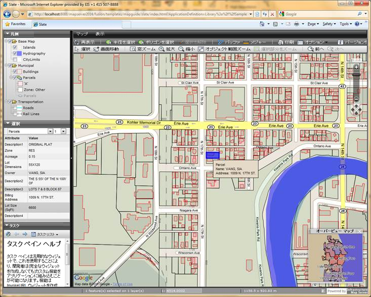 Infrastructure Map Server ビューアは、Web ブラウザでマップを表示する手段を提供します。空間データをインターネット上またはイントラネット上で使用可能にした後に、ユーザはデータを表示し、ビューアの 1 つでそれと対話することができます。