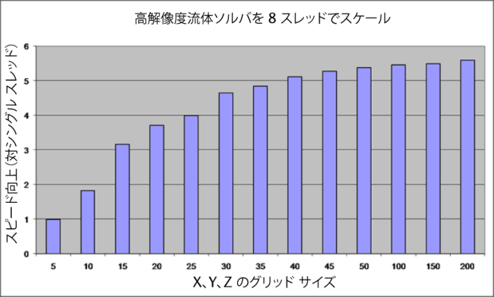 Maya のようなアプリケーションでは、前者よりも後者に近いため、適切に作成されたアルゴリズムであれば時間とともに拡張性の増大が期待できます。以下に、問題の規模が拡張性の向上につながることを示す流体ソルバの例を示します。