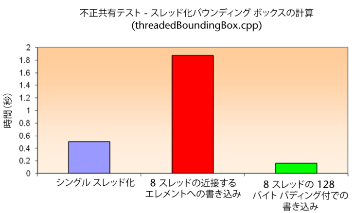 Maya で提供されるプラグイン threadedBoundingBox には偽共のコストが図示され、回避方法が示されます。このプラグインでは、バウンディング ボックスの 1 つの要素の計算に複数のスレッドが使用されます。各スレッドは、ポイントのサブセットに対するバウンディング ボックスの X の最小値を表す float 値を計算します。算出された値は配列に書き込まれます。計算はさまざまな方法で実行され、シングル スレッド化されてからマルチスレッド化されて、出力結果の保持に使用される配列要素のスペーシングが変更されます。