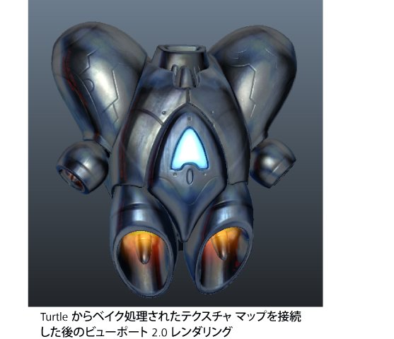 Turtle を使用してテクスチャをベイク処理した後、ShaderFX でテクスチャを視覚化することができます。Maya には ShaderFX グラフ ネットワークが用意されていて、Maya のアトリビュート エディタ(Attribute Editor)を使用してテクスチャに簡単に接続することができます。