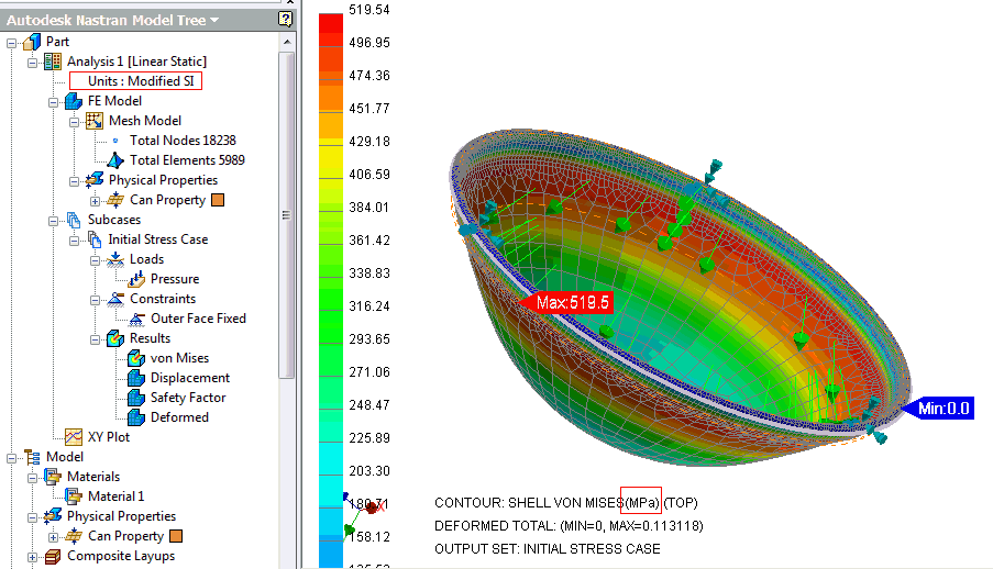 [解析]フォーム内で選択されている単位は、その特定の[解析]に対してのみ定義されます。単位は、PARAM、UNITS、MM として Nastran バルク データ ファイルに書き出されます。