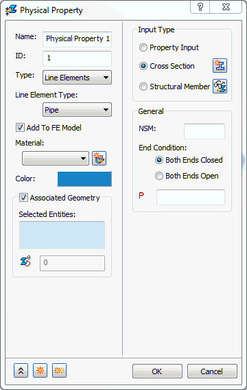 - [パイプ]: 内部圧力オプションを持つ、節点ごとに 6 自由度を持つ 1D 要素。このオプションを選択すると、[入力タイプ]セクションで[特性入力]、[断面]、[構造メンバー](SolidWorks バージョンのみ)のいずれかのオプションを使用できます。