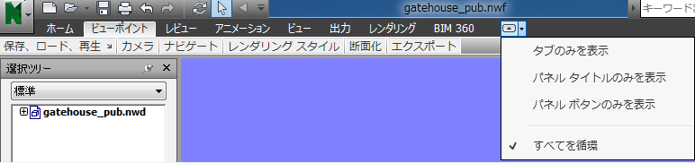 - すべてを循環: リボンの 4 つの状態が、リボン全体を表示、パネル ボタンのみを表示、パネル タイトルのみを表示、タブのみを表示の順に循環します。