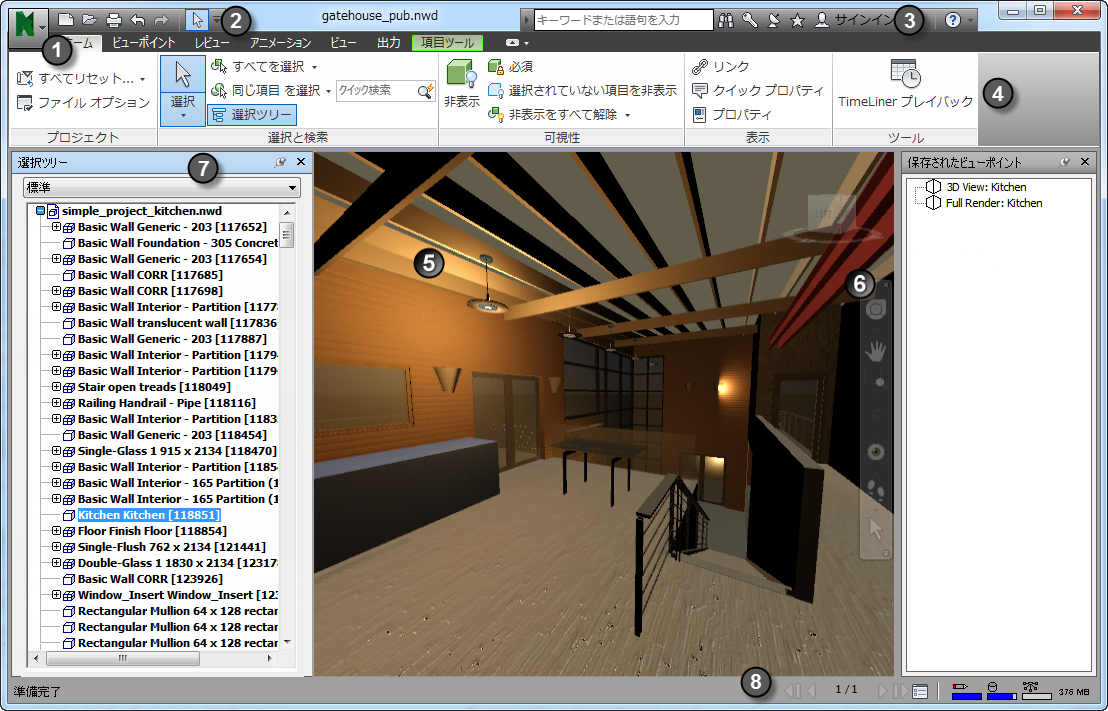 Autodesk Navisworks インタフェースは、理解しやすく、簡単に使用することができます。ユーザの作業方法に合わせてアプリケーション インタフェースを調整することができます。たとえば、使用頻度の低いドッキング可能ウィンドウを非表示にし、画面をすっきりさせることができます。リボン上およびクイック アクセス ツールバー上のボタンを追加または削除することもできます。