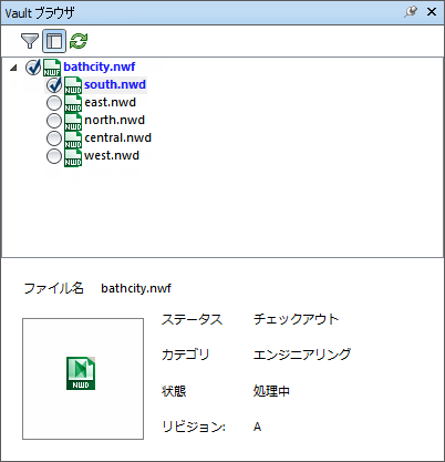 Vault ブラウザは、開いている Autodesk Navisworks ファイルの Vault ステータスを表示および管理できるドッキング可能なウィンドウです。これは、特に NWF ファイルで作業している場合に役立ちます。