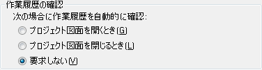 - [プロジェクトの詳細]ペインの[作業履歴の確認]で、次のオプションのいずれかをクリックします。このオプションでは、設計者が図面についての作業履歴情報を入力するタイミングを指定します。