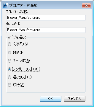 - [プロパティ名]に、シンボル リスト値の基になるコンポーネントまたはラインのプロパティ名を入力します(例: Blower_Manufacturers)。