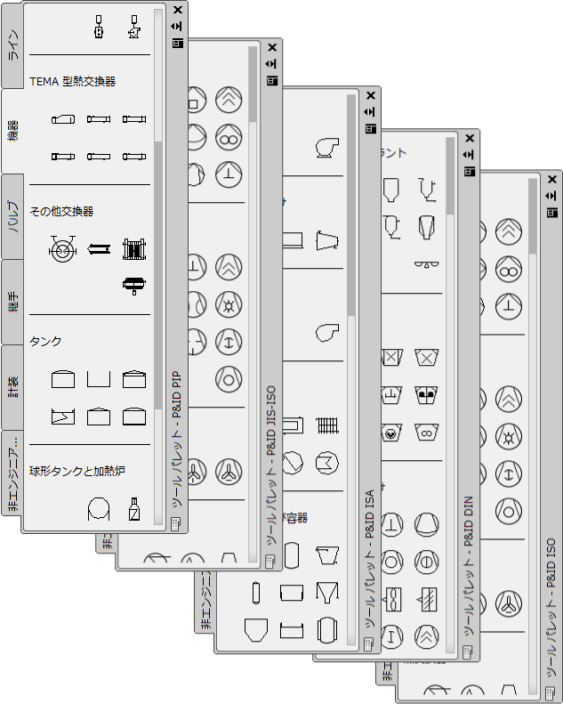 ツール パレットを切り替えるには、ツール パレットのタイトル バーを右クリックして別のツール パレットを選択します。ただし、ある工業規格で利用できるすべての P&ID シンボルを、別の工業規格でも同じように利用できるわけではありません。