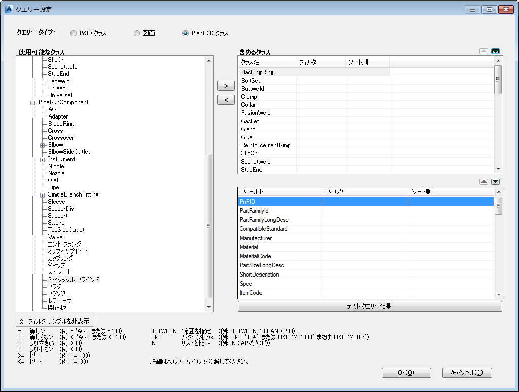 - [クエリー タイプ]で、[P&ID クラス]、[図面]、または[Plant 3D クラス]をクリックします。