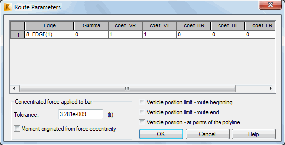 The bottom of the dialog box has the Tolerance field. It is a parameter assigned to a defined moving load analysis case. Tolerance determines the conditions for generating loads that originate from a defined vehicle, on bars. If the Moment originated from force eccentricity option is selected, a concentrated moment load from a concentrated force is generated and applied to the bar considering the eccentricity.
