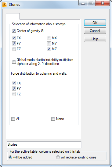 Note: The content of the Stories dialog depends on which tab is selected in the Stories table (Stories, Values, Displacements, Reduced forces, Total).