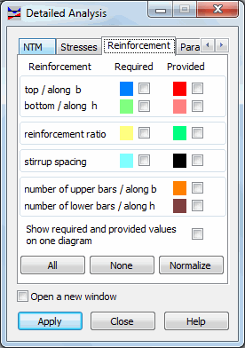 NTM, Stresses and Reinforcement select the quantities for the bars selected from a structure. The values of the selected quantities (displacements, internal forces, stresses, theoretical (required) or real (provided) values of reinforcement area or reinforcement ratio) will be presented graphically. They are visible in the viewer and the table. You can indicate several quantities to be presented simultaneously for the bars selected from a structure.