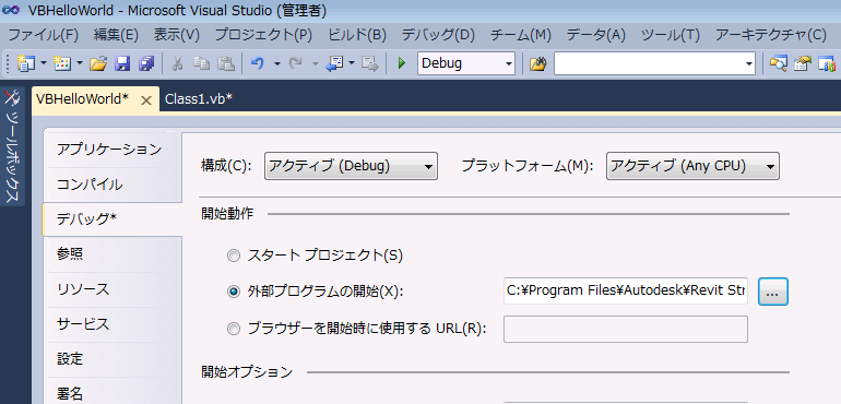 - [デバッグ]ウィンドウの[開始動作]セクションで、[外部プログラムを起動する]をクリックして Revit.exe ファイルを参照します。既定では、ファイルは次のパス: C:¥Program Files¥Autodesk¥Revit Structure 2012¥Program¥Revit.exe に格納されます。
