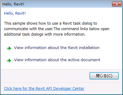 TaskDialog は単純な Windows メッセージボックスの代わりとなる Revit-スタイルのメッセージボックスです。これを使用して情報を表示したり、ユーザからの単純な入力を受け取ることができます。これには標準の順序で配列されているコントロールの共通セットがあり、Revit の他の部分と見た目と操作性に一貫性を持たせています。