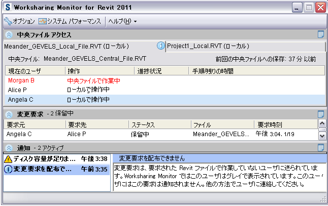 - [中央ファイル アクセス]ペインには、現在作業しているプロジェクト ファイルに関する情報が表示され、それらのプロジェクトで作業しているその他のユーザも識別されます。「プロジェクト ファイルへのアクセスをモニタする」を参照してください。