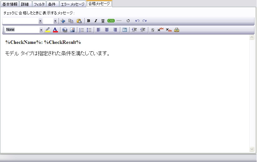 Model Review の[合格メッセージ]タブでは、実行したチェックが、指定された条件に一致したときに Results Browser に表示されるメッセージをコントロールします。