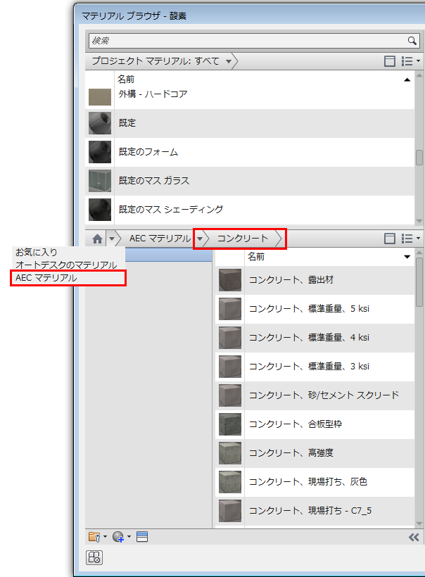 Revit の金属とコンクリート カテゴリの一般的な構造マテリアルがマッピングされます。これらのマテリアルは、Revit の AEC マテリアル ライブラリで確認できます。