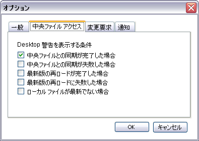 オプションを選択して中央ファイルの問題に関する Desktop 警告を受信するかどうかを指定します。これらの Desktop 警告を受信しないようにするには、オプションをオフにします。