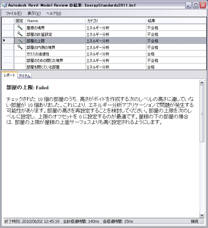 [アイテム]タブにはチェック結果に関する具体的な情報が表示されます。これにより、確認または手動修正を行うために、リストからアイテムを選択し、Revit を使用して、問題の原因が存在する場所を調整/編集するための最適なビューを見つけることができます。