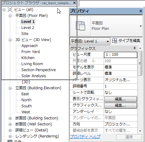 ウィンドウ グループとは、複数のウィンドウを同じ大きさで画面に表示する方法です。ウィンドウをグループ化した場合、グループ内の各ウィンドウの下にはタブが表示されます。グループ内のタブをクリックすると、該当するウィンドウが表示されます。ウィンドウのグループ化とグループ化解除は、必要に応じて行うことができます。次の図では、[プロジェクト ブラウザ]とプロパティ パレットがグループ化されています。プロパティ パレットがアクティブなタブであることに注意してください。