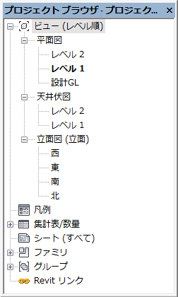 [プロジェクト ブラウザ]では、すべてのビュー、集計表、シート、グループ、現在のプロジェクトのその他のパーツの論理階層が表示されます。各ブランチを展開したり折りたたむと、下のレベル項目が表示されます。