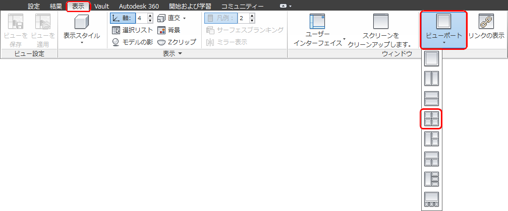 4つのビューポートを表示するには、表示タブでビューポートをクリックし、4を選択します: